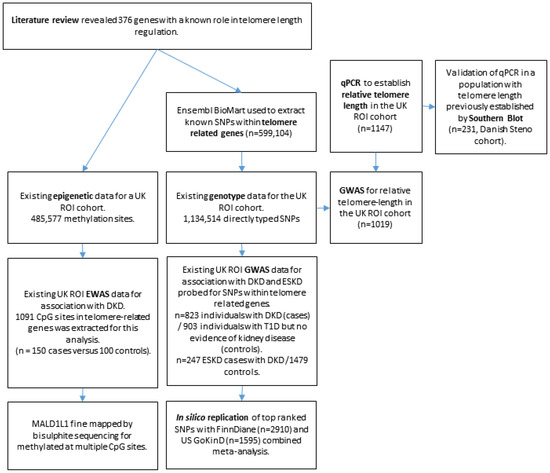 Genome-wide association studies and exome sequencing facilitated the discovery of telomere-related genes [39,40,41,42,43,44,45,46], aiding the identification of associations between telomere length and disease susceptibility [41,46,47,48,49,50,51,52]. Few studies have explored these associations in DKD, highlighting scope to harness additional diabetic populations [16,46,53,54,55,56,57,58,59]. We investigated genomic features affecting telomere biology in patients with T1D and a consistently defined clinical phenotype of DKD in four independent White European populations, evaluating telomere length in the largest population with T1D studied to date (Figure 1).