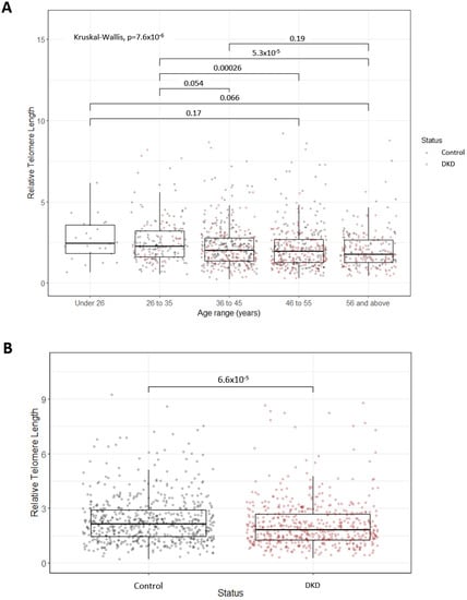 (A) Boxplots representing decreasing relative telomere length with advancing age. The P-value for the overall Kruskall–Wallis test highlighted significant differences between age groups. Pairwise comparisons using Wilcoxon tests were also carried out, with significant adjusted P-values displayed (Bonferonni correction). Points are coloured based on diabetic kidney disease (DKD) status. The numbers of individuals in each age group are as follows: Under 26, N = 24; 26 to 35, N = 181; 36 to 45, N = 369; 46 to 55, N = 359; 56 and above, N = 214. (B) Boxplots representing the significant difference in relative telomere length between individuals with DKD and control individuals with at least 15 years duration of T1D but no evidence of kidney disease. Significance was determined via a Wilcoxon test.
