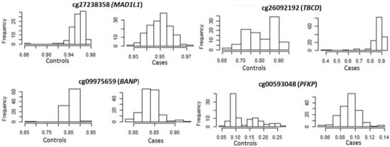 Distribution of methylation of top-ranked sites in end-stage kidney disease cases and controls.
