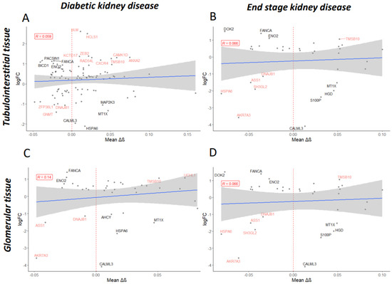 Mean delta-beta (Δβ) values per gene were determined for the differentially methylated CpG sites significantly associated with diabetic kidney disease (A,C) or end-stage kidney disease (B,D). Mean Δβ values were regressed on log fold change (logFC) values obtained during the differential expression analysis of RNA-sequencing data for tubulointerstitial (A,B) or glomerular (C,D) tissue from patients diagnosed with diabetic nephropathy versus controls (Levin et al.). Only genes shown to be significantly dysregulated (p-adj < 0.05) are displayed. Shown in black are genes of interest where delta-beta methylation values correlate accordingly with expression level changes (for example, increased methylation correlates with decreased expression); shown in red are genes which do not. Labelled are genes with ±1 logFC.
