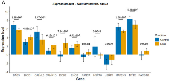 An additional RNA-sequencing dataset generated from the whole-kidney biopsies of control, early DKD and advanced DKD participants was harnessed [72]. LogFC values for genes of interest in this analysis were generally lower and, therefore, a fold change cut-off of greater than ±1 was utilised (Figure S3). CAMK1D, ENO2, FANCA, MTX1 and DOK2 displayed consistency between datasets (Figures S3 and S4, Figure 5 and Figure 6). For HSPA6, decreased expression occurred during early DKD, mirroring the first dataset; however, this study revealed a subsequent increase in HSPA6 expression during advanced DKD, which may better reflect the decreased methylation associated with ESKD.
