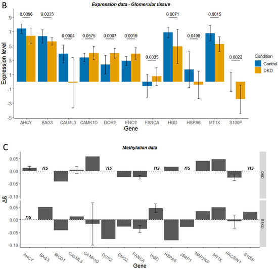 Expression level (Levin et al., normalised log2 read count) for control and diabetic kidney disease (DKD) tubulointerstitial (A) or glomerular (B) tissue for genes of interest. Delta-beta (Δβ) values for the CpG sites within these genes of interest, whose differential methylation was significantly associated with DKD or end-stage kidney disease (ESKD) (C). ns denotes genes that were not significantly differentially methylated in DKD/ESKD. Mean ± SD is shown. In graphs A and B, p-adjusted values from the differential expression analysis are shown.