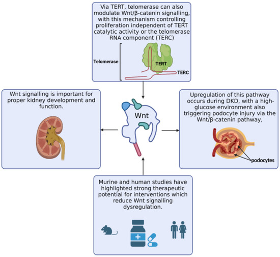 Via TERT, telomerase can also modulate Wnt/β-catenin signalling, with this mechanism controlling proliferation independent of TERT catalytic activity or the telomerase RNA component (TERC) [103,106,107]. Wnt signalling influences on kidney development and functioning, with potential for this pathway to be targeted for therapeutic interventions for DKD [108,109,110,111,112,113,114,115,116,117].