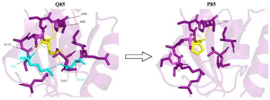 A strong electrostatic interaction network is observed in the presence of glutamine at the 85th position (yellow). Q85 forms polar interactions (yellow dashes) with K81, H88, A89, V117, D145, and T157. Most of these interactions are lost upon Q85P mutation. Also, due to the conformational position of D145 owing to the interaction with Q85, D145 is able to form a salt bridge (cyan dash) with K81. No such salt bridge formation is observed upon Q85P mutation.