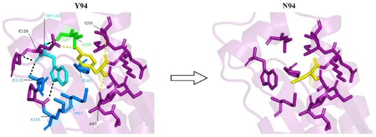 In the presence of tyrosine at the 94th position (yellow), a host of interactions, including hydrogen bonds with A90, Q98 and E109 (yellow dashes), weak π-π interaction with W108 (cyan residue), and hydrophobic interaction with L105 (green residue), are observed. Due to the conformational positioning of W108 owing to its π-π interaction with Y94, it is able to interact with multiple residues (black dashes and blue residues). No such interactions are observed upon Y94N mutation.