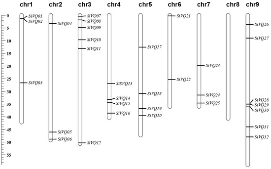Chromosomal localization of the foxtail millet SiVQ genes. The length of the chromosome is displayed on the left using a megabase (Mb) scale.