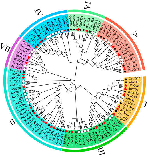 Phylogenetic analysis of VQs from Arabidopsis, rice, and foxtail millet. Numbers I–VII indicate different groups, and the different colors in the outermost circle represent different groups. Hollow circles, black stars, and red triangles represent VQs from Arabidopsis, rice, and foxtail millet, respectively.