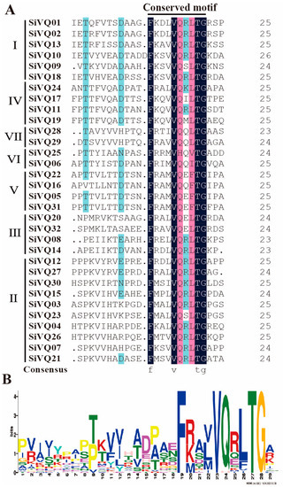 Multiple sequence alignment of foxtail millet VQs: (A) multiple sequence alignment of the VQ domain of 32 foxtail millet VQs, with conserved amino acids shaded in different colors; (B) conserved motif of SiVQs.