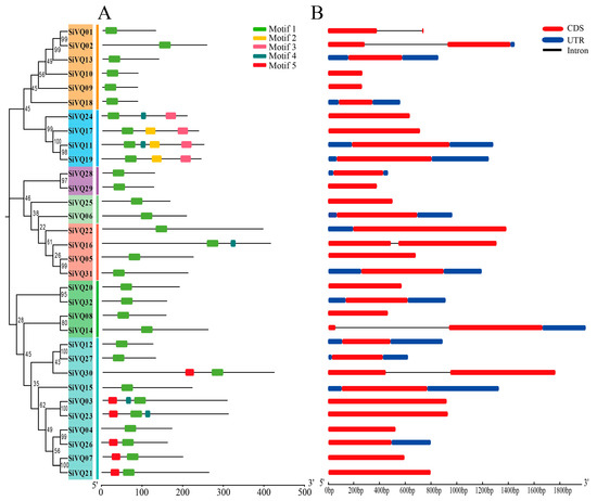 Conserved motifs and gene structure analyses of SiVQs based on phylogenetic relationships in foxtail millet: (A) motif composition of foxtail millet VQs, with motifs 1–5 represented by different colored boxes; (B) exon–intron structure analyses of VQ genes in foxtail millet. red boxes, blue boxes, and black lines represent the exons, 5′ and 3′ untranslated regions, and introns, respectively.