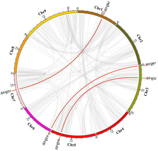 Syntenic analysis of the SiVQ genes. The grey lines in the background represent the collinear blocks within the foxtail millet genome, while the red lines highlight the syntenic SiVQ gene pairs.