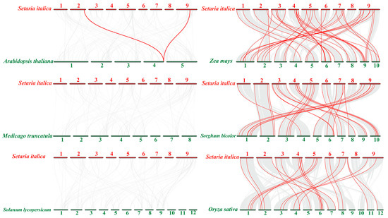 Synteny analysis of VQ genes between foxtail millet and six different plant species. The grey lines in the background represent the collinear blocks between the foxtail millet and other plant genomes, while the red lines highlight the collinear VQ gene pairs. The numbers represented chromosomes.