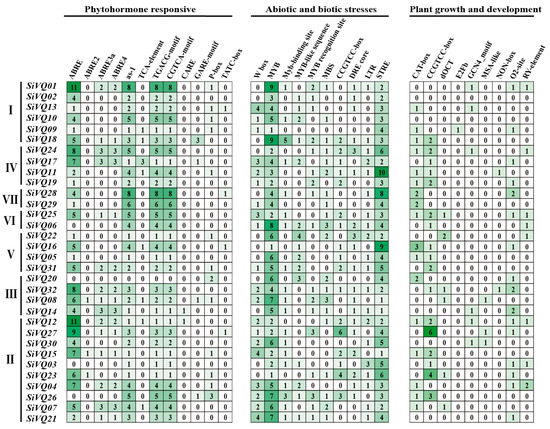 Cis-acting element analysis of the foxtail millet SiVQ gene family. Numbers I–VII indicated different groups classified based on phylogenetic relationships.