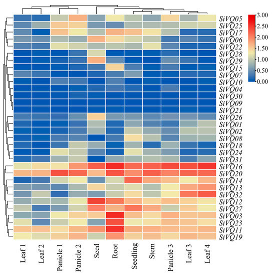 To characterize the expression patterns of SiVQs, the expression levels of the 32 SiVQs were analyzed in 11 different tissues to gain a preliminary insight into their potential functions (Figure 8). Based on the FPKM values, we found that 11 SiVQ genes (SiVQ03, SiVQ11, SiVQ12, SiVQ13, SiVQ14, SiVQ16, SiVQ19, SiVQ20, SiVQ23, SiVQ27, and SiVQ32) were highly expressed in different tissues, which were widely distributed in groups I to V, most of which belonged to groups II and III. By contrast, six SiVQ genes (SiVQ04, SiVQ07, SiVQ09, SiVQ10, SiVQ21, and SiVQ30) were low or not expressed in different tissues, which were clustered in groups I and II. (Figure 8). Certain genes had high expression levels in only one tissue. For example, SiVQ15 was highly expressed only in the root. Interestingly, the two SiVQs (SiVQ28 and SiVQ29) clustered in group VII showed similar expression and were relatively strongly expressed in the seed, and the paralogous gene pairs SiVQ03 and SiVQ23, as well as SiVQ11 and SiVQ19, also showed very similar expression patterns, with highest levels in the root. These results implicate that these SiVQs may have different roles during plant growth and development and that SiVQs within the same group may have similar or redundant functions.