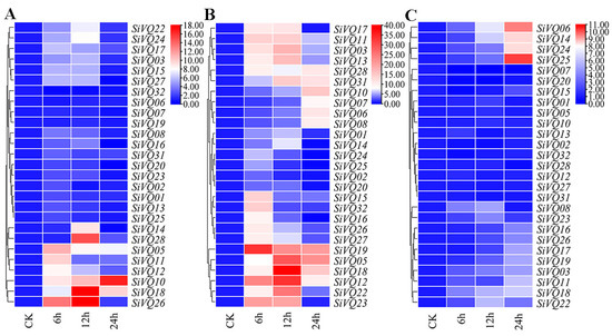 Many VQs have been implicated to be involved in abiotic stresses [11,12]. To clarify whether SiVQ genes respond to abiotic stresses, the expression levels of SiVQs under drought, salt, and low temperature were analyzed using qRT-PCR. Overall, many SiVQs exhibited upregulated expression under abiotic stress conditions (Figure 9). Under drought treatment, all SiVQs except SiVQ32 showed upregulated expression levels. Six and eight SiVQ genes started to respond to drought stress at 6 h and 12 h, respectively. Additionally, most of the upregulated SiVQ genes peaked at 12 h. Notably, the expression of four genes (SiVQ10, SiVQ18, SiVQ26, and SiVQ28) increased at least 10-fold under drought treatment (Figure 9A and Figure S1). Following salt stress treatment, all SiVQs exhibited upregulated expression levels. The expression of four SiVQ genes (SiVQ06, SiVQ07, SiVQ08, and SiVQ10) continuously increased and peaked at 24 h, while the expression of other SiVQs first increased and then decreased. In particular, the expression levels of six SiVQs (SiVQ05, SiVQ12, SiVQ18, SiVQ19, SiVQ22, and SiVQ23) were significantly upregulated (>20 fold) under salt stress (Figure 9B and Figure S1). Under cold treatment, the expression levels of 22 genes were induced, and the expression levels of 5 genes were inhibited. Overall, the response to cold was not as significant as the response to drought and salt stress for all SiVQs. Only four genes (SiVQ06, SiVQ14, SiVQ24, and SiVQ25) showed the most significant upregulated expression (>8 fold), and one gene (SiVQ07) showed significantly downregulated expression (13-fold) (Figure 9C and Figure S1).