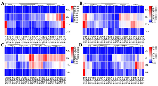Expression profiles of SiVQ genes under hormone treatments based on qRT-PCR: (A) gibberellin; (B) methyl jasmonate; (C) salicylic acid; (D) abscisic acid.