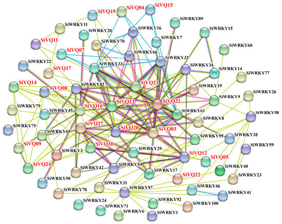 A protein interaction network between SiVQs and SiWRKYs was constructed using the STRING database to better understand the potential interactions. Notably, 15 SiVQs were predicted to interact with 28 SiWRKYs (Figure 11 and Table S6). Among these 15 SiVQ proteins, 3 SiVQs (SiVQ11, SiVQ17, and SiVQ19) interacted with only 1 SiWRKY, while 12 SiVQs interacted with more than 1 SiWRKY. Five SiVQs (SiVQ03, SiVQ20, SiVQ21, SiVQ23, and SiVQ32) interacted with more than seven SiWRKYs to generate a key node (Figure 11). Similar to some WRKYs [23,45], most SiVQ proteins interacted with other SiVQ proteins to function. These results may provide helpful information for future studies on the regulatory network of VQs.