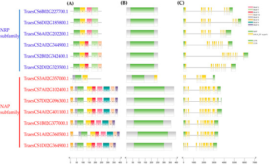 Analysis of the gene structure of TaNAP1. (A) Conserved mods of the TaNAP1 protein family, with motif1-motif 10 displayed in different colored boxes. (B) Conserved domain of the TaNAP1 protein family. (C) Gene structure of the TaNAP1 gene family, CDS (yellow rectangle), UTR (green rectangle), and introns (grey line). The sequence length is displayed at the bottom of the graph.