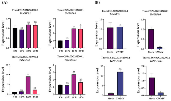 TaNAP1 gene expression levels under different stresses. (A) Measuring the relative expression levels of TaNAP1 in plants that were grown at various temperatures for 14 days by qRT-PCR. The average expression values from three independent biological replicates and three technical replicates were calculated. Data originating from the 8 °C treatment group were used as controls. (** p < 0.01; * p < 0.05; NS, p > 0.05). (B) The expression levels of TaNAP1 gene after CWMV infection. Changes in gene expression of wheat seedlings infected with CWMV for seven days and detected by RT-qPCR. Healthy wheat samples from the same batch were used as controls (** p < 0.01; * p < 0.05; NS, p > 0.05).
