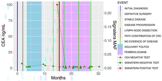 Another interesting aspect of our case was the change in ctDNA over time. ctDNA are fragments of DNA released by the tumor and are detectable in the bloodstream. In the largest observational cohort to date of postsurgical ctDNA surveillance in resected colorectal cancer, the presence of ctDNA has been independently associated with decreased recurrence-free survival [39]. In a cohort study of 96 consecutive patients diagnosed with stage III colon cancer treated with surgery and adjuvant chemotherapy, the 3-year recurrence-free interval was 30% when ctDNA was detectable compared to 77% when ctDNA was not detected [40].