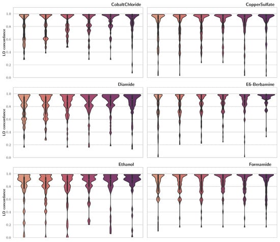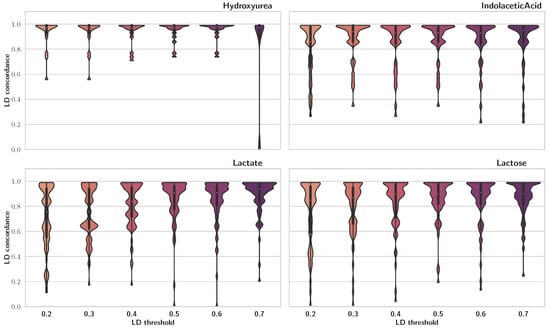 LD concordance between detected QTLs using FSF-GA and QTLs identified in [5]. Higher width indicates greater density. The central line in violin plots depicts quadrilles of the data, with the white circle as the median. We observe that, generally, higher LD cutoff thresholds result in more concordance between the two sets across different traits.