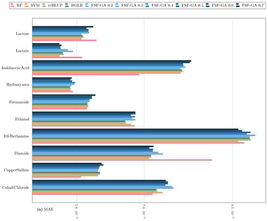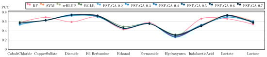 Regarding classical genetic selection models such as rrBLUP and BGLR [35], they are provided with the complete set of features. The results of this benchmark are illustrated in Figure 3 and Figure 4. The outcomes suggest that FSF-GA performs as well as rrBLUP and BGLR. FSF-GA exhibits comparable performance to SVM and RF. However, RF’s predictive performance can be highly variable in certain scenarios compared to other methods, such as Diamide/Indolacetic Acid, where RF’s predictions can be significantly better or worse than those of the other methods.