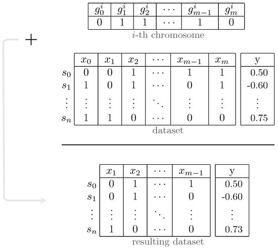 The fundamental components of the GA are chromosomes and three functions named fitness, mutate and crossover. The overall process of the proposed GA is illustrated in Figure 5. In our algorithm, each chromosome contains a vector of binary values (1/0) called genes. In other words, genes refer to the parameters of the solutions in our problem, which are different from genes in genetics and through this paper, we use gene(s) only in the context of GA. The length of each array is equal to the number of loci in genotypes. Setting each element in these arrays to 1/0 indicates that the corresponding feature should be used/discarded in the respective data subset. In other terms, these arrays mask the presence of features in the dataset, as demonstrated in Figure 6. The fitness function in the proposed GA simply calculates the fitness score on the training set, that is, in this study, using Bayesian Ridge regressor implementation from Scikit-learn package [42]. The key to selecting the model for the fitness function is that it should not have inherent L1 penalty (e.g., Lasso), so that redundant features affecting model performance are removed in the process. Tabu Search (TS) [43] is incorporated into our GA in order to improve local search and prohibit it from re-checking previously visited solutions. Furthermore, TS can save time by preventing redundant calculations in the fitness function.