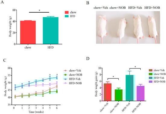NOB attenuates HFD−induced obesity. (A) Bodyweights of mice fed with chow or HFD (B) Images of Kunming mice treated with vehicle or NOB for 6 weeks. (C) Body weight of chow + Veh, chow + NOB, HFD + Veh and HFD + NOB. (D) Body weight gain. Graph bars in (A,C,D) marked with * stand for significant results; one−way ANOVA and Student’s t−test for analyzing statistical differences (* p < 0.05), n ≥ 6 per group.
