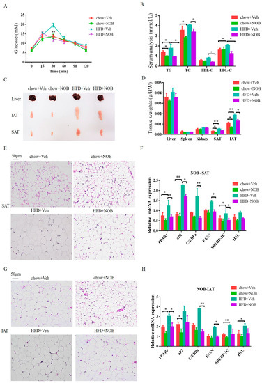 NOB improves glucose tolerance and lipid metabolic disorder in HFD−fed mice. (A) GTT (Glucose tolerance test) results. (B) The contents of TC (total cholesterol), TG (total glyceride), HDL−C (high−density lipoprotein cholesterol) and LDL−C (low-density lipoprotein cholesterol). (C) The patterns of the liver, IAT and SAT. (D) The tissue weight of chow and NOB−treated mice. (E) The sections of H&E staining from SAT. Scale bar, 50 μm. (F) The mRNA level of PPARγ, ap2, C/EBPα, FASN, SREBP−1C and HSL in SAT. (G) The sections of H&E from IAT. Scale bar, 50 μm. (H) The mRNA level of PPARγ, ap2, C/EBPα, FASN, SREBP−1C and HSL in IAT. Data are shown as mean ± SEM. Significance test between groups was conducted by utilizing Student’s t−test or ANOVA (* p < 0.05, ** p < 0.01).