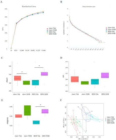 NOB improves intestinal flora diversity in HFD-induced mice. (A) The curve of rarefaction. (B) The curve of rank abundance. (C) Chao1 index in the ɑ−diversity analysis. (D) ACE index in the ɑ−diversity analysis. (E) Simpson index in the ɑ−diversity analysis. (F) The analysis Bray−Curtis−based PCoA plot from each sample. Points are from individual mice. Significant test results based on one−way ANOVA along with Student’s t-test (* p < 0.05).