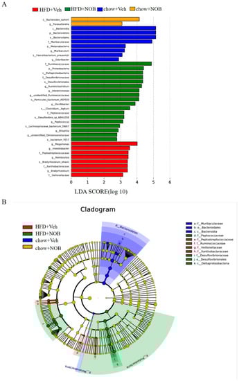 Furthermore, we performed (LEfSe) analysis coupled with linear discriminant analysis (LDA) to explore specific biomarkers of gut microbiota achieved with the nonparametric factors Wilcoxon test. The results presented that there were significant differences in abundance between NOB−treated and control mice. As shown in Figure 5A,B, 36 populations were demonstrated as the key variables for separating gut microbiota under different treatment groups (the logarithmic LDA score > 2.0), in which 18 of the OTUs (2 were assigned to Peptococcaceae, 7 to Ruminococcaceae and 6 to Proteobacteria) were shown in NOB-treated HFD mice group (Figure 5B). Next, 8 OTUs were displayed in the HFD group (3 were assigned to Peptostreptococcaceae, 2 were assigned to Veillonellaceae and 3 were assigned to Xanthobacteraceae) (Figure 5B), 8 OTUs were displayed in the chow diet group (2 were assigned to Muribaculaceae, 3 were assigned to Bacteroidales and 2 were assigned to Bacteroidia). Two OTUs were displayed in the NOB−treated chow group (1 belonging to phylum Bacteroidetes and 1 belonging to phylum Proteobacteria). Collectively, the intestinal flora of the chow−fed mice mainly belongs to phylum Bacteroidetes and the NOB−treated HFD mice, as well as HFD mice, belong to phylum Proteobacteria, whereas the NOB-treated chow mice have no distinct changes. These results showed that NOB administration could lead to various changes in the gut microbial composition of mice.