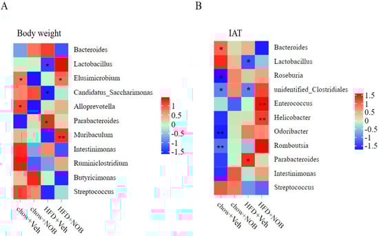 The correlation is between adipose tissue and intestinal flora in chow or HFD−fed mice. The different relevance between the intestinal flora and body weight (A) as well as adipose tissue (B) in chow or HFD-fed mice under NOB treatment (* p < 0.05, ** p < 0.01).