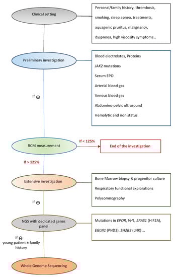 On the other hand, congenital erythrocytosis related to germline mutations, is rare, and usually diagnosed after extensive testing, including molecular genetic testing. When confronted to a new case of erythrocytosis, several aspects must be explored in order to clarify the diagnosis (Figure 1) [12]. Apparent reasons of erythrocytosis must be excluded: chronic hypoxia (due to respiratory failure, chronic obstructive pulmonary dysfunctions, sleep apnea, congenital heart defects…), tumors (kidney, uterine fibroma…). As such, several easy and cost effective analysis must be conducted: blood electrolytes, proteins, serum EPO, arterial/venous blood gas, abdomino-pelvic ultrasound, hemolytic and iron status, bone marrow biopsy and progenitor culture, respiratory functional explorations, polysomnography. The compilation of clinical and biological evidence can specify the origin of the disease and help distinguish congenital erythrocytosis from PV. However, recent studies have shown that germline mutations could also be found in MPN cases, misleading the diagnosis [13,14,15].