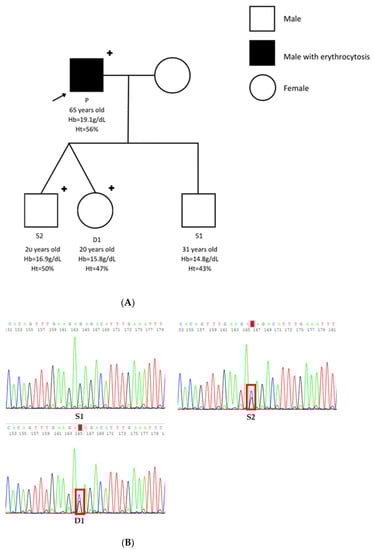 A familial segregation analysis was performed, seeking familial erythrocytosis. His three children were explored: twins (one daughter, one son) and another son (Table 1). Genetic sequencing exploring the JAK2 E846D variant was performed by using Sanger sequencing. The pedigree (Figure 2A) showed no familial history of erythrocytosis.