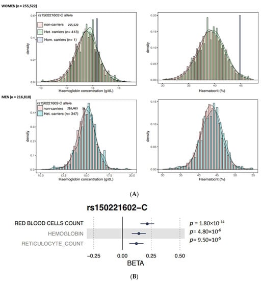 An in silico analysis of the identified JAK2 E846D variant with the large-scale biomedial database UK biobank was performed (gathering genetic and health information from half a million UK participants). The JAK2 E846D variant was found in 760 individuals (347 men and 413 women) almost exclusively in heterozygous state (only one homozygous woman). The curves of values obtained for the carriers of the variants are almost overlapping the curves of the wild type individuals. Compared to controls, slight significant increases in Hb (13.6 versus 13.5 g/dL, p = 0.034) and Ht (39.2 versus 39.2%, p = 0.052) were noted in women carrying the JAK2 E846D variant, whereas the increases in Hb and Ht were not significant in men (15.1 vs. 15.0 g/dl and 43.5 vs. 43.3%, respectively, p > 0.05) (Figure 3A). Furthermore, this variant was significantly associated (p < 5 × 10−8) with higher red blood cell counts but not reticulocyte count or Hb (Figure 3B), suggesting a potential role of the variant in erythropoietic stimulation but to a lesser degree than observed with the driver JAK2 V617F mutation.