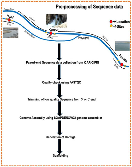 The sediment samples from the Ganga River at Kanpur and Farakka locations and the Yamuna River at Delhi were collected from three sites each. Using a genomic DNA (gDNA) isolation kit, gDNA was extracted from 250 mg of river sediment samples (Nucleospin Soil, Takara, Mountain View, CA, USA). Subsequently, the high-quality isolated DNA was subjected to 1% agarose gel (loaded 5 μL) electrophoresis at 110 V for 30 min and acceptable quality of sediment gDNA was used later on for next-generation library preparation. The quality of the gDNA was determined based on A260/280 ratio, where 1 μL from each sample was loaded in Nanodrop 2000. The concentration of gDNA was further assessed using Qubit 3.0 Fluorometer developed by Thermo Fisher Scientific, Waltham, MA, USA The DNA extracted from the collected samples was sequenced by Illumina Trueseq technology [22]. The data was generated at ICAR-Central Inland Fisheries Research Institute, West Bengal, India. The sequencing depths for the metagenomic samples from Kanpur, Farakka and Delhi were ~32 million reads/sample, ~37 million reads/sample and ~66 million reads/sample, respectively.