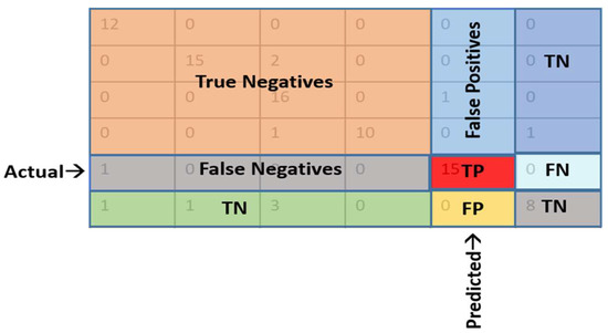 The confusion matrix for multiclass classification.TP: truly predicted into positive class, TN: truly predicted into negative class, FP: falsely predicted into positive class and FN: falsely predicted into negative class.