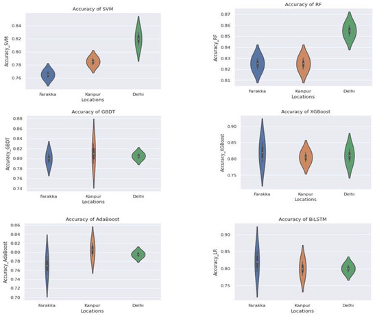 Violin plot showing accuracy of SVM, RF, GBDT, XGBoost, AdaBoost and BiLSTM at three different locations.