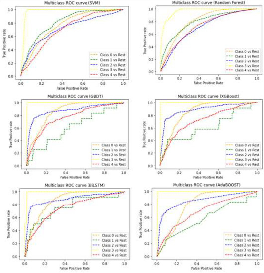 ROC curves for SVM, RF, GBDT, XGBoost, AdaBoost and BiLSTM of five different classes of microbes such as bacteria, archaea, eukaryota, fungi, viruses and other microbes represented as classes 0–4, respectively.
