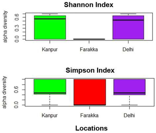Box plots illustrating α diversity indices (Shannon diversity, Simpson index) for the samples collected from Kanpur, Farakka, and Delhi locations. A lower Shannon index and higher Simpson index represents low diversity.
