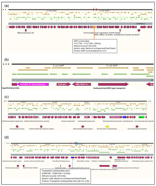 Sections of the chromosomal region of the rhizobial strain ‘10ap3’ showing open reading frames, contigs and coding regions (CDs). Different arrows on the figure represent genes on the chromosome and the selected genes of interest are highlighted with different colors on the CDs just below the contigs: (a) adenosine monophosphate (AMP) nuclease, purine conversion located on contig 11, (b) inosine-5-monophosphate located on contig 11, (c) siderophores aerobactin synthesis genes located on contig 3 and (d) auxin biosynthesis genes, tryptophan synthase α and β chains located on contig 18. Different arrows on the figure represent genes on the chromosome and the selected genes of interest are highlighted with different colors below the contigs.