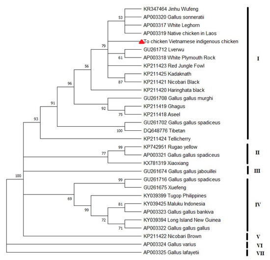 Vietnam is known for being one of the domesticated chicken centers in Southeast Asia. However, the origin and history of the domestication of Vietnamese native chickens are still uncertain. The complete mitochondrial genome sequence supplied important genetic information for accurately measuring phylogenetic relationships. In this study, the mitochondrial genome sequences and structures were determined for To chicken. The complete mtDNA genome of To chicken was 16,874 bp in size and included 13 protein-coding genes, 22 tRNA genes, two rRNA genes, and one non-coding region (D-loop region) similar to the mitochondrial genome of other vertebrates. The overall A + T contents of To chicken mtDNA genomes was 53.98% with the percentage of each nucleotide composition being 32.51% for C, 30.26% for A, 23.72% for T, and 13.51% for G which were similar to those of some Chinese native breeds such as Wuhua three-yellow chickens, Longsheng Feng chickens, Luhua chickens, Piao chickens, Taoyan chickens, and Huangshan Black chickens [33,34,35,36,37,38]. Moreover, the overall composition of Indian local chickens is in the order G > A > T > C [39].