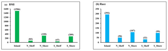 Methylated cytosines can be found in gene bodies, 3’ untranslated regions (UTRs), other/open sea areas derived from genome-wide association studies, CpG islands, shores, shelves, open seas, and sites surrounding the transcription sites (200 to 1500 bp, 5’ UTR, and exons 1) for coding genes. The regions 0–2 kb from CpG islands is referred to as shores, the regions 2–4 kb from CpG islands are referred to as shelves, and the other/open sea regions are isolated CpG sites in the genome that do not have a specific name [22]. Figure 2 shows the distribution of the genomic location of the significant differentially methylated regions between NW and OW/OB children and between EA and AA children, where most of the target IDs in both groups were islands, 1506 and 292 for BMI and racial group, respectively. Table 2 and Table 3 show some clusters of target IDs of the top obesity-related significant genes with a methylation difference of more than 10%. Some of the top hits for genes differentially methylated between NW and OW/OB children were PCDHGA4, BRD2, PTPRN2, and DIP2C, while those between the racial groups EA and AA were PTPRN2, TNXB, MDLL1, and PRDMI6.