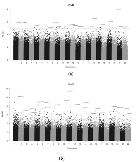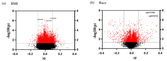 At the genomic scale, the Manhattan plots show the p-values for the complete epigenome-wide association studies (EWAS). The p-values for each target ID are shown in Figure 3a,b by chromosome and position on the chromosome in genomic order (x-axis). The number on the y-axis represents the p-values log10 value, which is equal to one more zero after the decimal point. The Manhattan plots were created using the qqman software in the R-package to illustrate the chromosomal distribution of the significant associations, and volcano plots are shown in Figure 4a,b to visualize the overall size and direction of the associations. From the volcano plots, some of the top hits for the BMI group included cg20242624, cg2230998, and cg19714851, while for the racial groups, the top target IDs were cg03111560 and cg09125754.