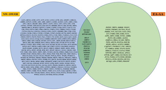 Venn diagram of overlapping significant genes between NW and OW/OB children and between EA and AA children.
