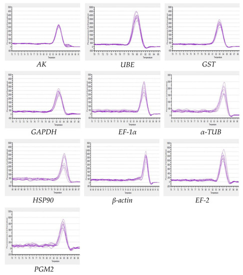 Dissociation curves of 10 candidate reference genes. The genes in this figure include arginine kinase (AK), ubiquitin-conjugating enzyme E2b (UBE), glutathione S-transferase (GST), glyceraldehyde-3-phosphate dehydrogenase (GAPDH), elongation factor 1α (EF-1α), elongation factor 2 (EF-2), α-tubulin (α-TUB), heat shock protein 90 (HSP90), β-actin (β-ACTIN), phosphoglucomutase 2 (PGM2).