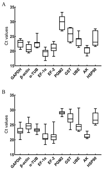 The Chinese mitten crab (E. sinensis) is an important economic aquatic animal in China. At present, more and more studies on E. sinensis are concerned with the aspects of cultivation, reproductive development, disease and nutrition [23,24]. Some of these studies involved gene expression analysis. In order to obtain reliable results, it was necessary to screen stable reference genes. Huang et al. [11] compared the expression level of 10 reference genes in different tissues and different development and molting stages of E. sinensis. The result showed that the expression level of reference genes was not stable, which implied that the stability of the reference gene should be assessed to screen out the suitable reference gene depending on different experimental conditions.