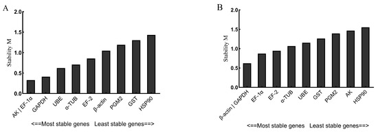 Four kinds of software are usually used to evaluate the stability of reference genes: geNorm (V3.5, Ghent, Belgium) [15], NormFinder (V0953, Aarhus, Denmark) [16], BestKeeper (V ersion1.0, Munich, Germany) [17] and Ref-Finder (Version 1.0, http://www.leonxie.com/referencegene.php (accessed on 4 May 2021)). geNorm selects more stable reference genes by calculating the average expression stability value (M), which is defined as the average pairwise variation of the particular gene with all other control genes. The criterion is that the smaller the M value, the more stable the reference gene. To determine the optimal number of reference genes, the pairwise variation (V) between sequential ranked genes (Vn/Vn+1) is calculated using geNorm. If the value of Vn/Vn+1 is <0.15, the optimal number of reference genes is n; when the value of Vn/Vn+1 is >0.15, the best reference gene number is n + 1. The principle of calculation and criterion of NormFinder is similar to that of geNorm. The stable value of reference gene expression is obtained first, and then the optimal reference gene is selected. The lower the stability value, the better the stability of expression. BestKeeper determines the reference gene by comparing standard deviation (SD). The smaller the standard deviation and coefficient of variation, the more stable the reference gene. Ref-Finder is applied to determine the comprehensive ranking of the most stable reference genes by geNorm, NormFinder and BestKeeper. Many studies have shown that it is not recommended to use only one reference gene, but to select multiple reference genes, which could improve the accuracy of gene expression analysis [18,19,20].