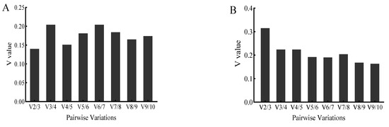 In studies requiring high accuracy in expression quantification, the use of a single internal reference gene is not sufficient for experimental purposes. Therefore, the use of two or more stably expressed internal reference genes to correct for target gene expression has become a new guideline in quantitative PCR [37], and Vandesompele et al. [15] suggest that when V is less than 0.15, there is no need to add more internal reference genes for correction. In this experiment, the paired variations (V) of each internal reference gene was also analyzed (Figure 5). As shown in Figure 5A, the value of V2/3 was <0.15 under V. anguillarum stimulation, indicating that two reference genes could be accurately standardized (Figure 5A). However, the V9/10 value was >0.15 under copper ion stimulation, indicating that more reference genes were needed for proofreading (Figure 5B).