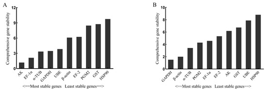 Comprehensive analysis by Ref-Finder of 10 candidate reference genes stimulated by V. anguillarum (A) and copper ions (B). The genes in this figure include arginine kinase (AK), elongation factor 1α (EF-1α), α-tubulin (α-TUB), glyceraldehyde-3-phosphate dehydrogenase (GAPDH), ubiquitin-conjugating enzyme E2b (UBE), β-actin (β-ACTIN), elongation factor 2 (EF-2), phosphoglucomutase 2 (PGM2), glutathione S-transferase (GST), heat shock protein 90 (HSP90).