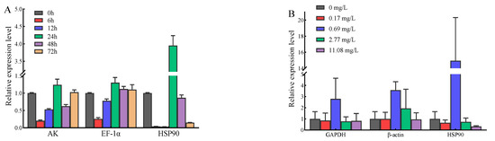In order to verify the reliability of the appropriate reference gene, EsPrx4 expression stimulated by V. anguillarum and copper ions was evaluated. Under the stimulation of V. anguillarum, the expression trend of EsPrx4 was similar when the two most stable reference genes (AK and EF-1α) were selected. However, the expression level of EsPrx4 was totally changed, especially at 24 h, when the least stable reference, HSP90, was selected. It was 3.18 times and 3.03 times higher than that of AK and EF-1α as the reference genes, respectively (Figure 7A). Under the stimulation of copper ions, the expression trend of EsPrx4 was similar when the two most stable reference genes (GAPDH and β-ACTIN) were selected. When HSP90 (the least stable reference) was selected as the reference gene, the expression level of EsPrx4 in the 0.69 mg/L group was 5.34 times and 4.18 times higher than that of GAPDH and β-ACTIN as the reference genes, respectively (Figure 7B).
